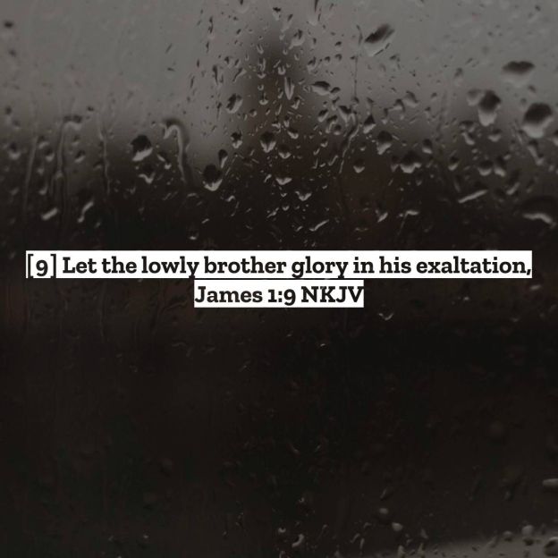 The Apostle James says here “Let the person of lowly or humble circumstances glory or boast in his exaltation or high position with God” What is James saying here? In the world you might not be considered important, you might even be considered an outcast in society, however don’t worry about that, Rejoice because you are a Child of God, you are an heir of the Kingdom with Christ, you have been Chosen by Christ to be in His eternal Kingdom, and nobody can take that away from you