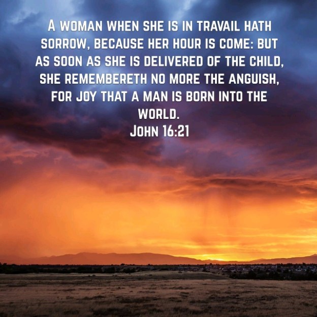 Verily, verily, I say unto you, That ye shall weep and lament, but the world shall rejoice: and ye shall be sorrowful, but your sorrow shall be turned into joy. A woman when she is in travail hath sorrow, because her hour is come: but as soon as she is delivered of the child, she remembereth no more the anguish, for joy that a man is born into the world. John 16:20-21