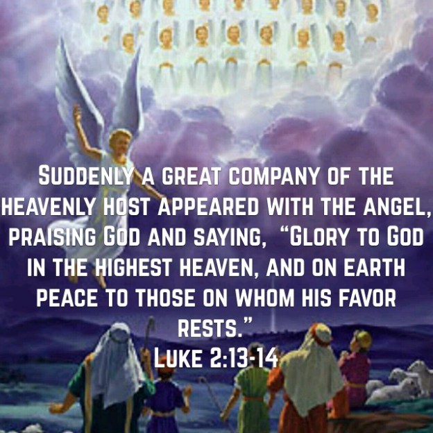 Suddenly a great company of the heavenly host appeared with the angel, praising God and saying, “Glory to God in the highest heaven, and on earth peace to those on whom his favor rests.” Luke 2:13-14