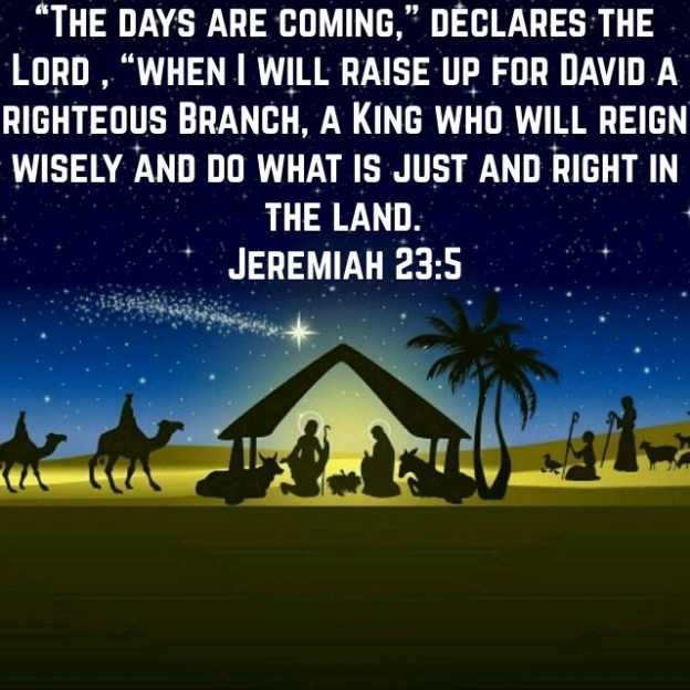 “The days are coming,” declares the LORD, “when I will raise up for David a righteous Branch, a King who will reign wisely and do what is just and right in the land. Jeremiah 23:5