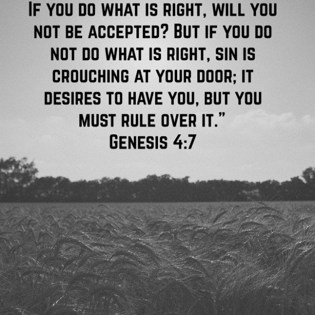 If you do what is right, will you not be accepted? But if you do not do what is right, sin is crouching at your door; it desires to have you, but you must rule over it.” Genesis 4:7