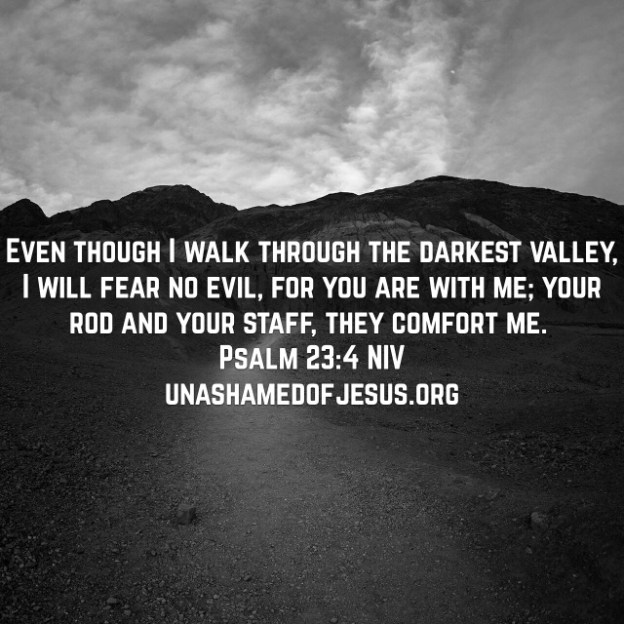 Even though I walk through the darkest valley, I will fear no evil, for you are with me; your rod and your staff, they comfort me. Psalm 23:4