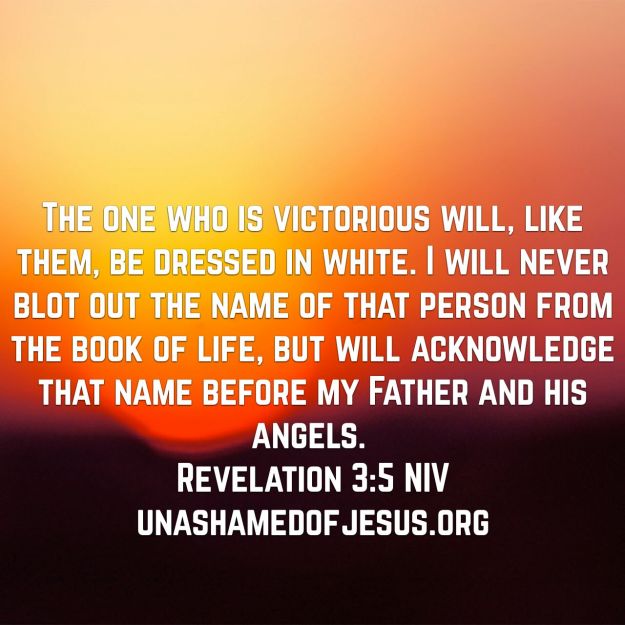 The one who is victorious will, like them, be dressed in white. I will never blot out the name of that person from the book of life, but will acknowledge that name before my Father and his angels.