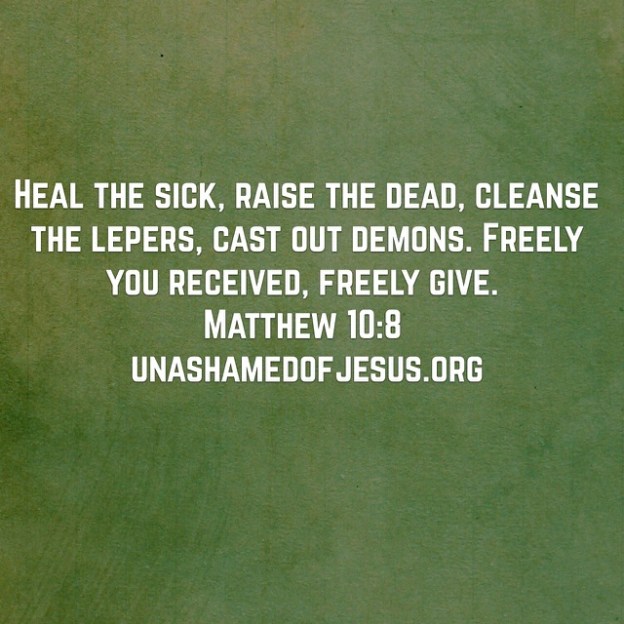 And as you go, preach, saying, ‘The kingdom of heaven is at hand.’ “Heal the sick, raise the dead, cleanse the lepers, cast out demons. Freely you received, freely give. Matthew 10:7-8