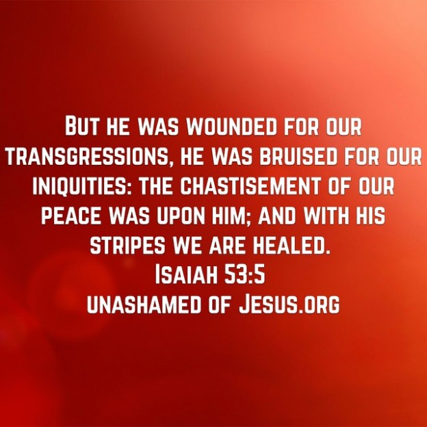 But he was wounded for our transgressions, he was bruised for our iniquities: the chastisement of our peace was upon him; and with his stripes we are healed. Isaiah 53:5