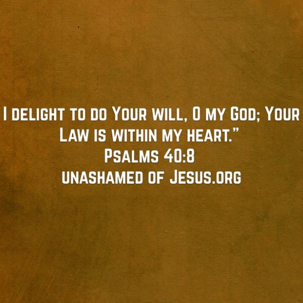 I delight to do Your will, O my God; Your Law is within my heart.” Psalm 40:8