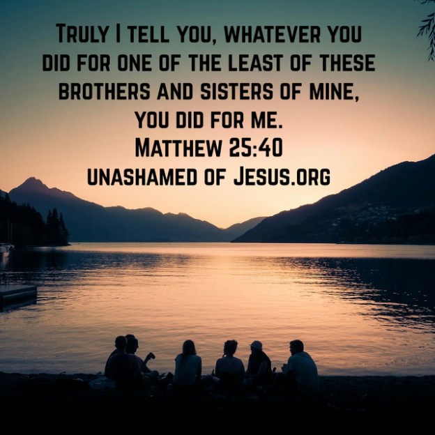 “Then the righteous will answer Him, ‘Lord, when did we see You hungry, and feed You, or thirsty, and give You something to drink? ‘And when did we see You a stranger, and invite You in, or naked, and clothe You? ‘When did we see You sick, or in prison, and come to You?’ “The King will answer and say to them, ‘Truly I say to you, to the extent that you did it to one of these brothers of Mine, even the least of them, you did it to Me.’ Matthew 25: 38-40