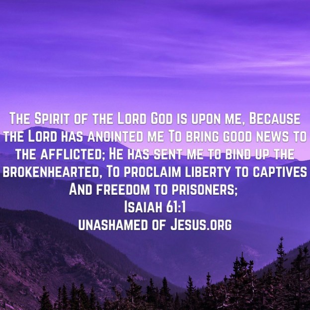 The Spirit of the Lord GOD is upon me, Because the LORD has anointed me To bring good news to the afflicted; He has sent me to bind up the brokenhearted, To proclaim liberty to captives And freedom to prisoners;