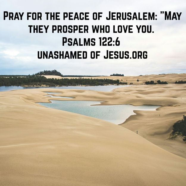 Pray For Jerusalem 7 Replies P Pray for the peace of Jerusalem: “May they prosper who love you. Psalms 122:6 NASB http://bible.com/100/psa.122.6.NASB Share this: Click to share on X (Opens in new window) X Click to share on Facebook (Opens in new window) Facebook Like Loading... Related