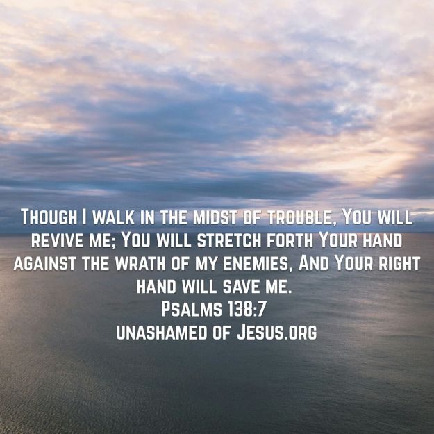 Revive Me 6 Replies Though I walk in the midst of trouble, You will revive me; You will stretch forth Your hand against the wrath of my enemies, And Your right hand will save me. Psalms 138:7 NASB http://bible.com/100/psa.138.7.NASB Share this: Click to share on X (Opens in new window) X Click to share on Facebook (Opens in new window) Facebook Like Loading... Related
