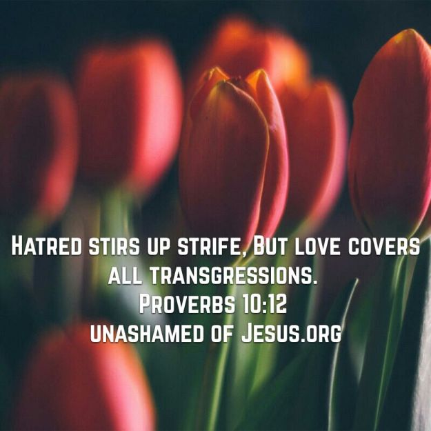 Love Covers All 1 Reply Hatred stirs up strife, But love covers all transgressions. Proverbs 10:12 NASB http://bible.com/100/pro.10.12.NASB Share this: Click to share on X (Opens in new window) X Click to share on Facebook (Opens in new window) Facebook Like Loading... Related