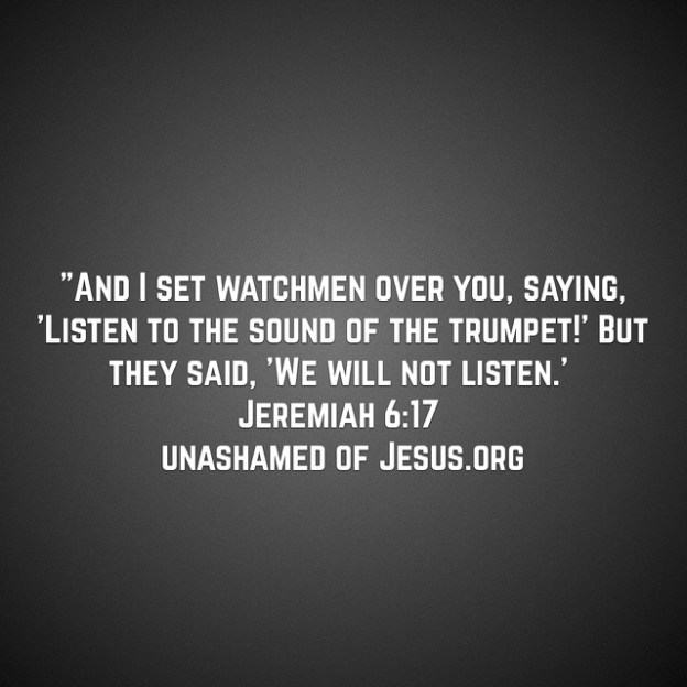 “And I set watchmen over you, saying, ‘Listen to the sound of the trumpet!’ But they said, ‘We will not listen.’ Jeremiah 6:17