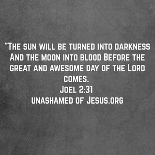 #Eclipse2017 Leave a reply “The sun will be turned into darkness And the moon into blood Before the great and awesome day of the Lord comes. Joel 2:31 NASB http://bible.com/100/jol.2.31.NASB Share this: Click to share on X (Opens in new window) X Click to share on Facebook (Opens in new window) Facebook Like Loading... Related