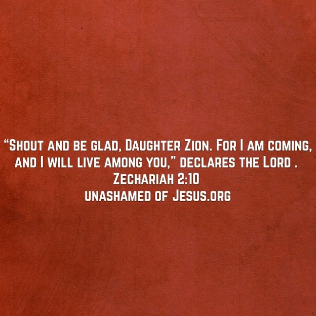 “Shout and be glad, Daughter Zion. For I am coming, and I will live among you,” declares the LORD. Zechariah 2:10