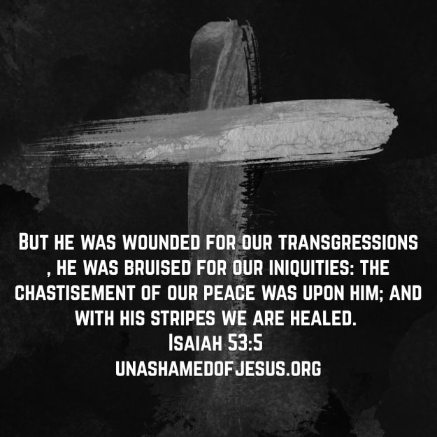 But he was wounded for our transgressions, he was bruised for our iniquities: the chastisement of our peace was upon him; and with his stripes we are healed.