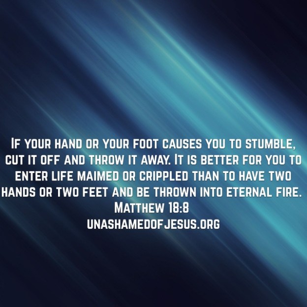 “If your hand or your foot causes you to stumble, cut it off and throw it from you; it is better for you to enter life crippled or lame, than to have two hands or two feet and be cast into the eternal fire. Matthew 18:8