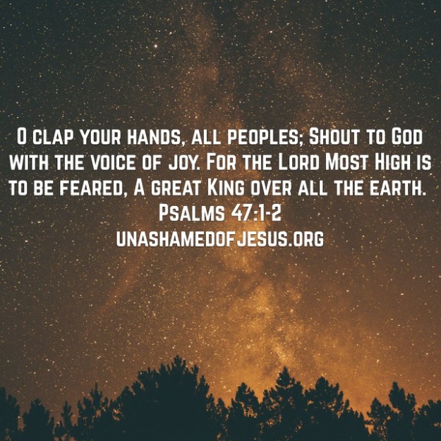 O clap your hands, all peoples; Shout to God with the voice of joy. For the Lord Most High is to be feared, A great King over all the earth.