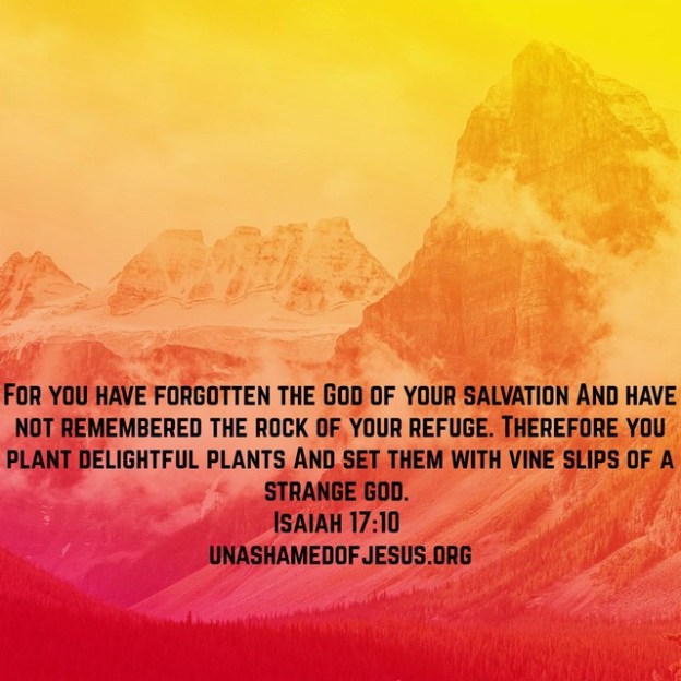 For you have forgotten the God of your salvation And have not remembered the rock of your refuge. Therefore you plant delightful plants And set them with vine slips of a strange god. Isaiah 17:10