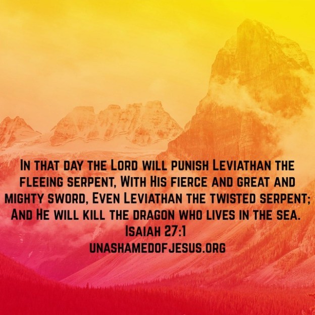 In that day the LORD will punish Leviathan the fleeing serpent, With His fierce and great and mighty sword, Even Leviathan the twisted serpent; And He will kill the dragon who lives in the sea. Isaiah 27:1