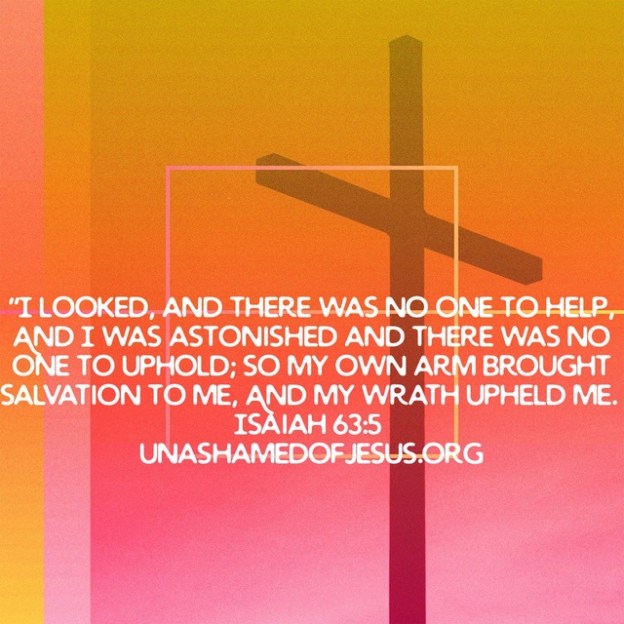 “I looked, and there was no one to help, And I was astonished and there was no one to uphold; So My own arm brought salvation to Me, And My wrath upheld Me. Isaiah 63:5