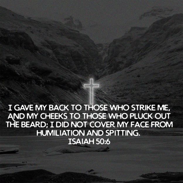 I gave My back to those who strike Me, And My cheeks to those who pluck out the beard; I did not cover My face from humiliation and spitting.