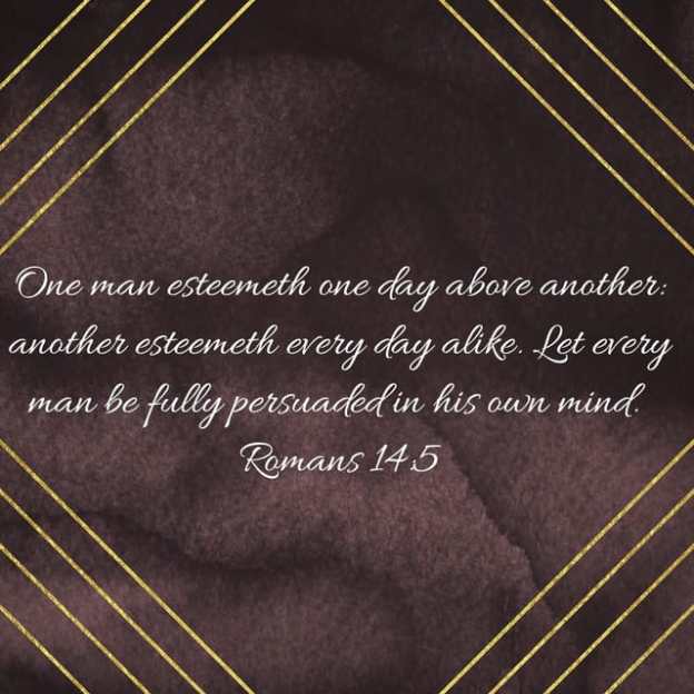 One man esteemeth one day above another: another esteemeth every day alike. Let every man be fully persuaded in his own mind. He that regardeth the day, regardeth it unto the Lord; and he that regardeth not the day, to the Lord he doth not regard it. He that eateth, eateth to the Lord, for he giveth God thanks; and he that eateth not, to the Lord he eateth not, and giveth God thanks. Romans 14:5-6