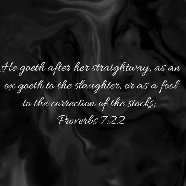 He goeth after her straightway, as an ox goeth to the slaughter, or as a fool to the correction of the stocks; Till a dart strike through his liver; as a bird hasteth to the snare, and knoweth not that it is for his life. Proverbs 7:22-23