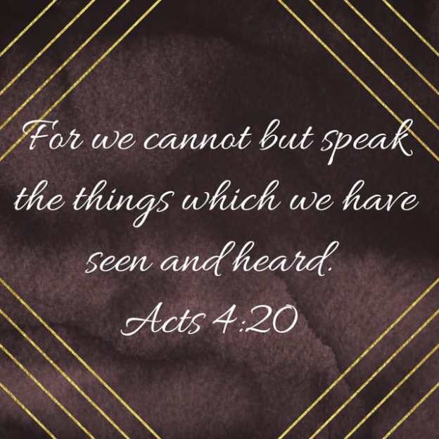 But Peter and John answered and said unto them, Whether it be right in the sight of God to hearken unto you more than unto God, judge ye For we cannot but speak the things which we have seen and heard. So when they had further threatened them, they let them go, finding nothing how they might punish them, because of the people: for all men glorified God for that which was done. Acts 4:19-21