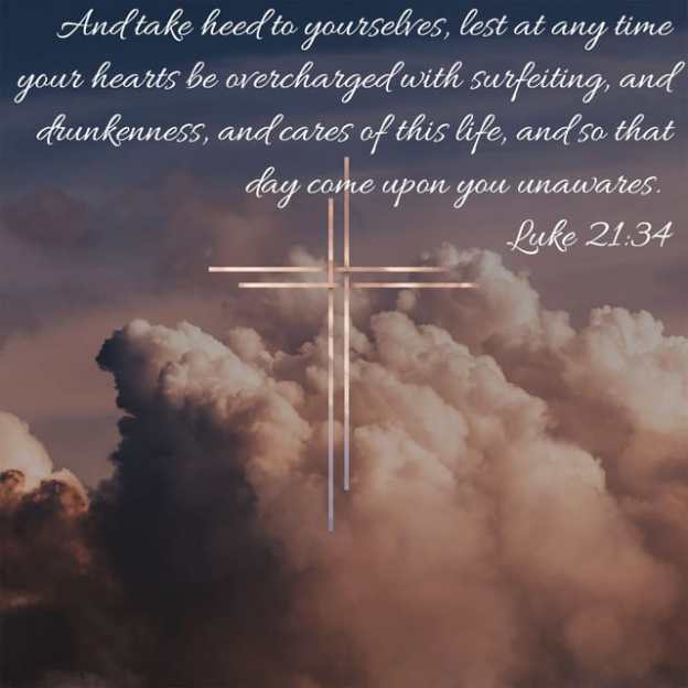 And take heed to yourselves, lest at any time your hearts be overcharged with surfeiting, and drunkenness, and cares of this life, and so that day come upon you unawares.For as a snare shall it come on all them that dwell on the face of the whole earth. Watch ye therefore, and pray always, that ye may be accounted worthy to escape all these things that shall come to pass, and to stand before the Son of man.  Luke 21:34-36