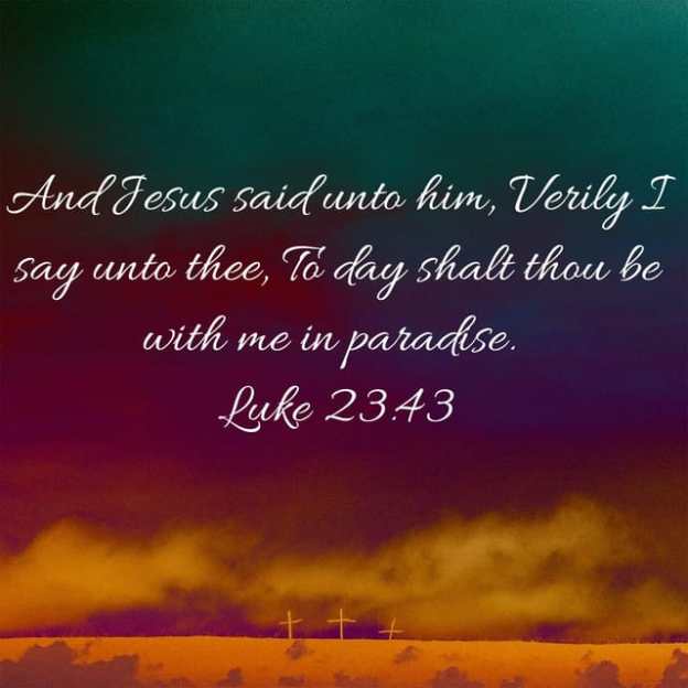And Jesus said unto him, Verily I say unto thee, To day shalt thou be with me in paradise. Luke 23:43
