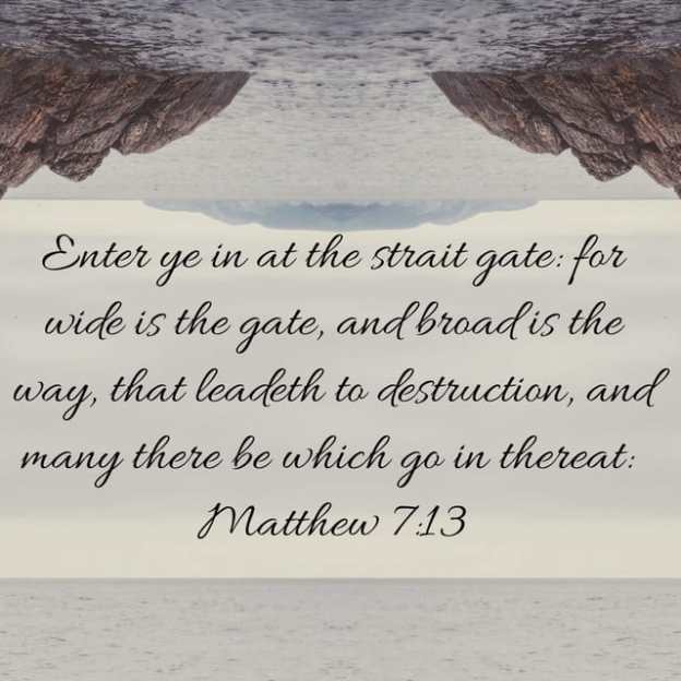Enter ye in at the strait gate: for wide is the gate, and broad is the way, that leadeth to destruction, and many there be which go in thereat: Because strait is the gate, and narrow is the way, which leadeth unto life, and few there be that find it. Matthew 7:13-14
