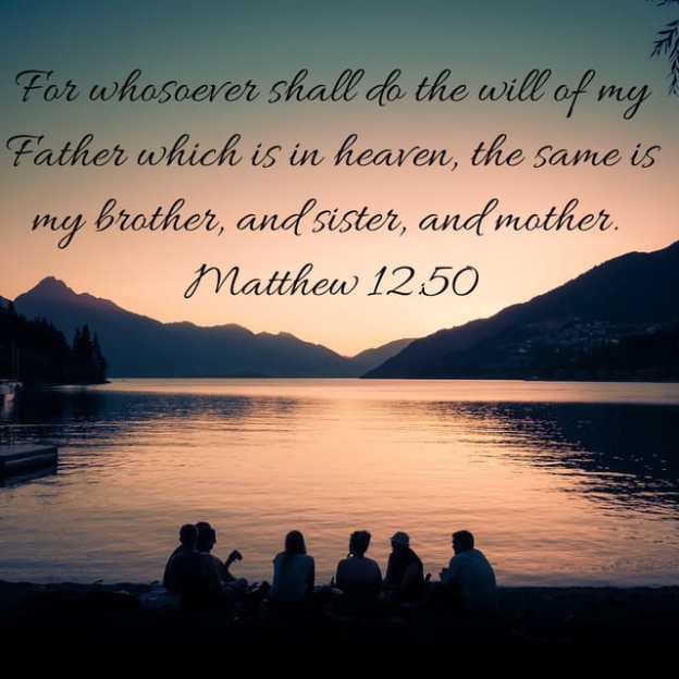 While he yet talked to the people, behold, his mother and his brethren stood without, desiring to speak with him. Then one said unto him, Behold, thy mother and thy brethren stand without, desiring to speak with thee. But he answered and said unto him that told him, Who is my mother? and who are my brethren? And he stretched forth his hand toward his disciples, and said, Behold my mother and my brethren! For whosoever shall do the will of my Father which is in heaven, the same is my brother, and sister, and mother. Matthew 12:46-50