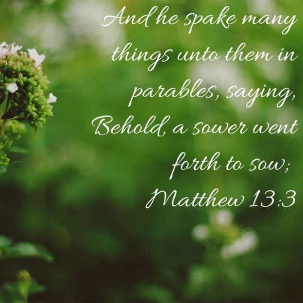 And he spake many things unto them in parables, saying, Behold, a sower went forth to sow; And when he sowed, some seeds fell by the way side, and the fowls came and devoured them up: Some fell upon stony places, where they had not much earth: and forthwith they sprung up, because they had no deepness of earth: And when the sun was up, they were scorched; and because they had no root, they withered away. And some fell among thorns; and the thorns sprung up, and choked them: But other fell into good ground, and brought forth fruit, some an hundredfold, some sixtyfold, some thirtyfold. Who hath ears to hear, let him hear. Matthew 13:3-9