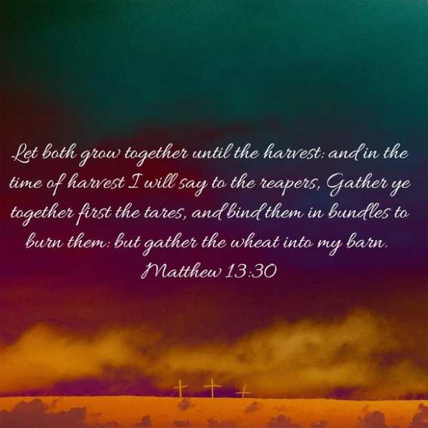 Let both grow together until the harvest: and in the time of harvest I will say to the reapers, Gather ye together first the tares, and bind them in bundles to burn them: but gather the wheat into my barn Matthew 13:30