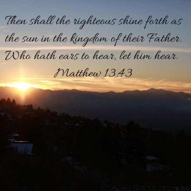 Then Jesus sent the multitude away, and went into the house: and his disciples came unto him, saying, Declare unto us the parable of the tares of the field. He answered and said unto them, He that soweth the good seed is the Son of man; The field is the world; the good seed are the children of the kingdom; but the tares are the children of the wicked one; The enemy that sowed them is the devil; the harvest is the end of the world; and the reapers are the angels. As therefore the tares are gathered and burned in the fire; so shall it be in the end of this world. The Son of man shall send forth his angels, and they shall gather out of his kingdom all things that offend, and them which do iniquity; And shall cast them into a furnace of fire: there shall be wailing and gnashing of teeth. Then shall the righteous shine forth as the sun in the kingdom of their Father. Who hath ears to hear, let him hear. Matthew 13:36-43
