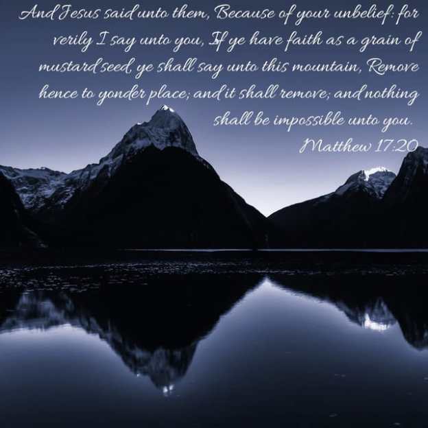 Then Jesus answered and said, O faithless and perverse generation, how long shall I be with you? how long shall I suffer you? bring him hither to me. And Jesus rebuked the devil; and he departed out of him: and the child was cured from that very hour. Then came the disciples to Jesus apart, and said, Why could not we cast him out? And Jesus said unto them, Because of your unbelief: for verily I say unto you, If ye have faith as a grain of mustard seed, ye shall say unto this mountain, Remove hence to yonder place; and it shall remove; and nothing shall be impossible unto you. Matthew 17:17-20