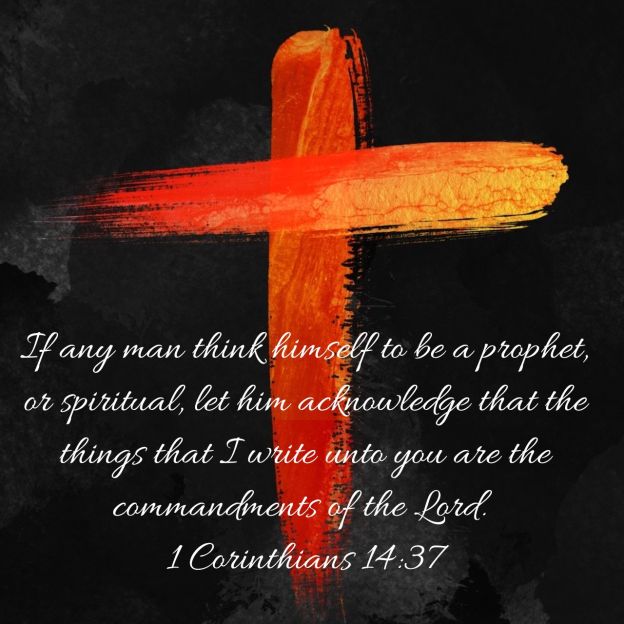 What? came the word of God out from you? or came it unto you only? If any man think himself to be a prophet, or spiritual, let him acknowledge that the things that I write unto you are the commandments of the Lord. But if any man be ignorant, let him be ignorant. Wherefore, brethren, covet to prophesy, and forbid not to speak with tongues. Let all things be done decently and in order. 1 Corinthians 14:36-40