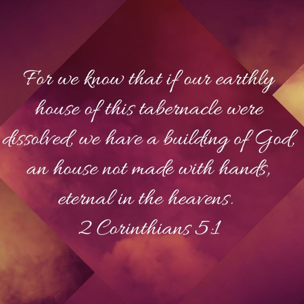 For we know that if our earthly house of this tabernacle were dissolved, we have a building of God, an house not made with hands, eternal in the heavens. For in this we groan, earnestly desiring to be clothed upon with our house which is from heaven: If so be that being clothed we shall not be found naked. For we that are in this tabernacle do groan, being burdened: not for that we would be unclothed, but clothed upon, that mortality might be swallowed up of life. Now he that hath wrought us for the selfsame thing is God, who also hath given unto us the earnest of the Spirit. 2 Corinthians 5:1-5