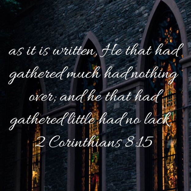 For I mean not that other men be eased, and ye burdened: But by an equality, that now at this time your abundance may be a supply for their want, that their abundance also may be a supply for your want: that there may be equality: As it is written, He that had gathered much had nothing over; and he that had gathered little had no lack. 2 Corinthians 8:13-15