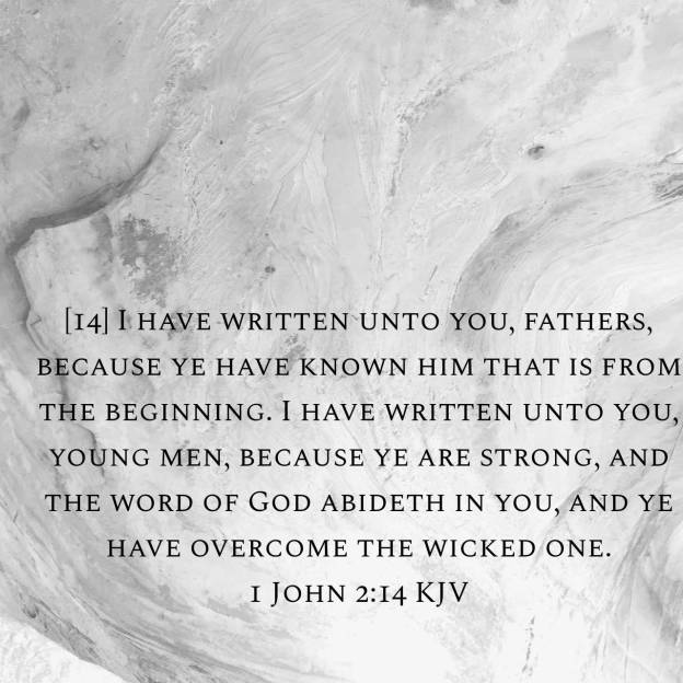 I write unto you, little children, because your sins are forgiven you for his name’s sake. I write unto you, fathers, because ye have known him that is from the beginning. I write unto you, young men, because ye have overcome the wicked one. I write unto you, little children, because ye have known the Father. I have written unto you, fathers, because ye have known him that is from the beginning. I have written unto you, young men, because ye are strong, and the word of God abideth in you, and ye have overcome the wicked one. 1 John 2:12-14