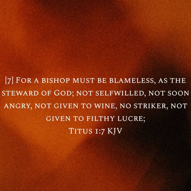 We continue to look at the Apostle Paul’s divine instruction for the order and structure of the Church. Yesterday we looked at Gods qualifications for an elder or Pastor of the Church, today we are looking at the qualifications of a Bishop. Now if you look at the different English translations of verse 7, you get a more detailed idea of what the role of a Bishop is. It’s derived from the original Greek word “episkopon” which means overseer , this individual oversees many Churches not just one particular Church