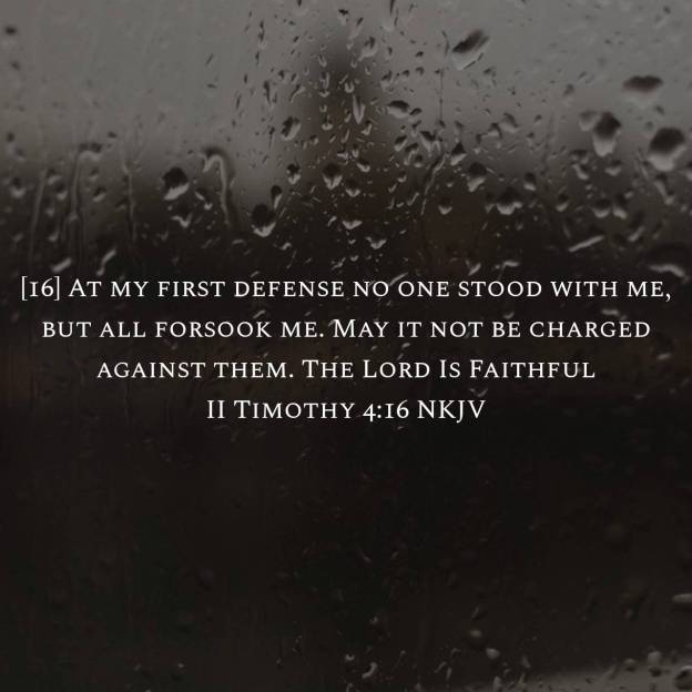 But notice the Apostle Pauls response to all those who abandoned and persecuted him, “May it not be charged against them” reminds you when The Lord was hanging on the cross and said “Father forgive them for they know not what they do” (Luke 23:34) Let The Lord be your vindicator, pray for your enemies even when its hard