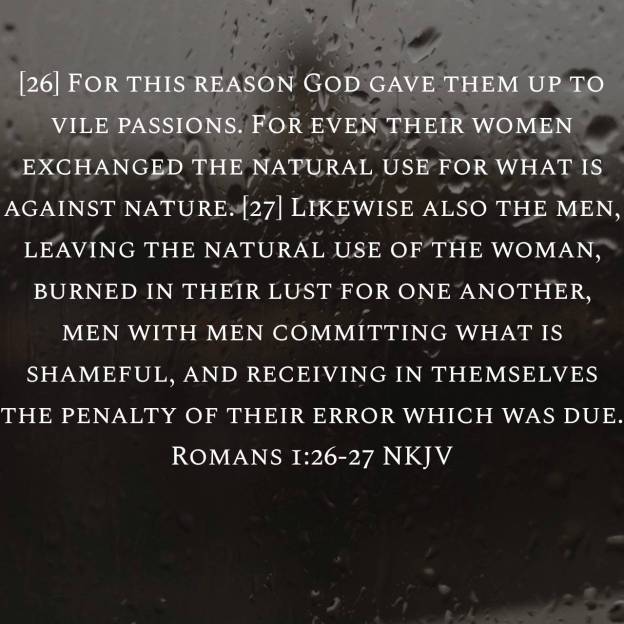 For this cause God gave them up unto vile affections: for even their women did change the natural use into that which is against nature: And likewise also the men, leaving the natural use of the woman, burned in their lust one toward another; men with men working that which is unseemly, and receiving in themselves that recompence of their error which was meet. Romans 1:26-27
