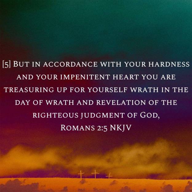 The world will ask “Why do I need Jesus”? What most of the world doesn’t understand is everyday they are storing up wrath against themselves as they continue to rebel and live in sin against God. As the Apostle Paul says here “according to your hardness , stubborn, and impenitent or unrepentant heart” People who refuse to repent of their sins, have a hard heart to God, “you are treasuring or storing up wrath” Everyday you are adding more and more wrath to your final judgement