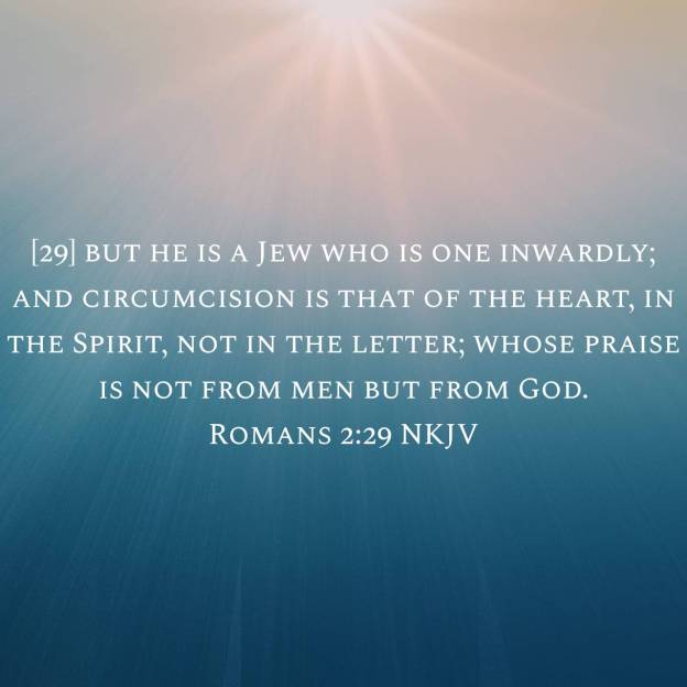 For circumcision verily profiteth, if thou keep the law: but if thou be a breaker of the law, thy circumcision is made uncircumcision. Therefore if the uncircumcision keep the righteousness of the law, shall not his uncircumcision be counted for circumcision? And shall not uncircumcision which is by nature, if it fulfil the law, judge thee, who by the letter and circumcision dost transgress the law? For he is not a Jew, which is one outwardly; neither is that circumcision, which is outward in the flesh: But he is a Jew, which is one inwardly; and circumcision is that of the heart, in the spirit, and not in the letter; whose praise is not of men, but of God. Romans 2:25-29
