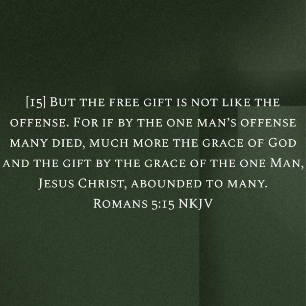 But not as the offence, so also is the free gift. For if through the offence of one many be dead, much more the grace of God, and the gift by grace, which is by one man, Jesus Christ, hath abounded unto many. And not as it was by one that sinned, so is the gift: for the judgment was by one to condemnation, but the free gift is of many offences unto justification. For if by one man’s offence death reigned by one; much more they which receive abundance of grace and of the gift of righteousness shall reign in life by one, Jesus Christ.) Romans 5:15-17