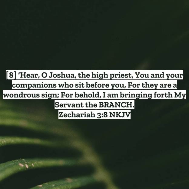 ‘Hear, O Joshua, the high priest, You and your companions who sit before you, For they are a wondrous sign; For behold, I am bringing forth My Servant the BRANCH. Zechariah 3:8