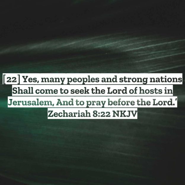 Yes, many peoples and strong nations Shall come to seek the LORD of hosts in Jerusalem, And to pray before the LORD.’ “Thus says the LORD of hosts: ‘In those days ten men from every language of the nations shall grasp the sleeve of a Jewish man, saying, “Let us go with you, for we have heard that God is with you.” ’ ” Zechariah 8:22-23