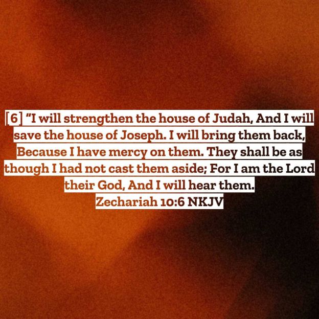 They shall be like mighty men, Who tread down their enemies In the mire of the streets in the battle. They shall fight because the LORD is with them, And the riders on horses shall be put to shame “I will strengthen the house of Judah, And I will save the house of Joseph. I will bring them back, Because I have mercy on them. They shall be as though I had not cast them aside; For I am the LORD their God, And I will hear them. Zechariah 10:5-6