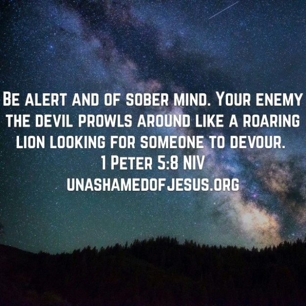 Be alert and of sober mind. Your enemy the devil prowls around like a roaring lion looking for someone to devour. 1 Peter 5:8